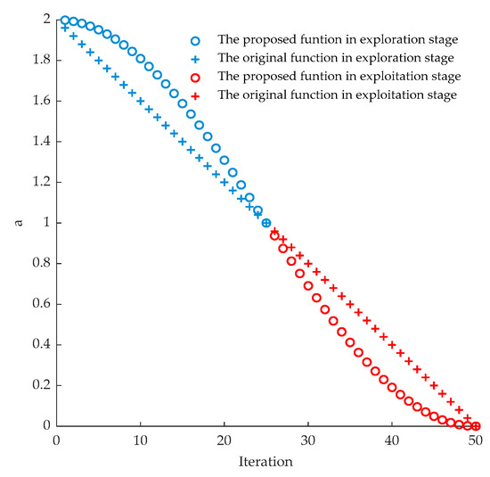 where t and T represent the current iteration and the maximum number of iterations, respectively. In addition, the comparison of the proposed function and the original one for updating the components of over the course of the iterations is intuitively exhibited in Figure 1. As can be seen from Figure 1, the values of are generally larger in the proposed function during the first half of the iterations, which could contribute to improving the exploration ability of the algorithm at this stage. The corresponding effects in the exploitation phase would be obtained with smaller values of , compared to the original ones.