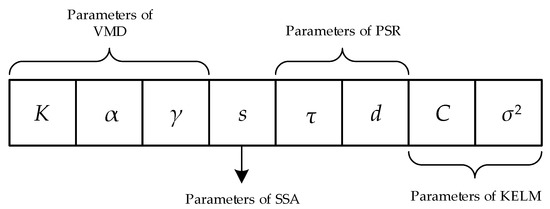 In order to effectively optimize the parameters in various modules, as well as construct the hybrid forecasting model, the proposed IHGWOSCA algorithm is adopted to handle this problem. To begin with, the parameters of SSA, PSR, and KELM for all the sub-series are considered to be the same in this study, which could facilitate fast convergence as well as reduce computation. Hence, the total number of the variables is eight, while the corresponding coding strategy of the agents in the proposed IHGWOSCA is described in Figure 2. Additionally, the metric root-mean-square error (RMSE) represented in Equation (27) is adopted as the objective function for parameter optimization.