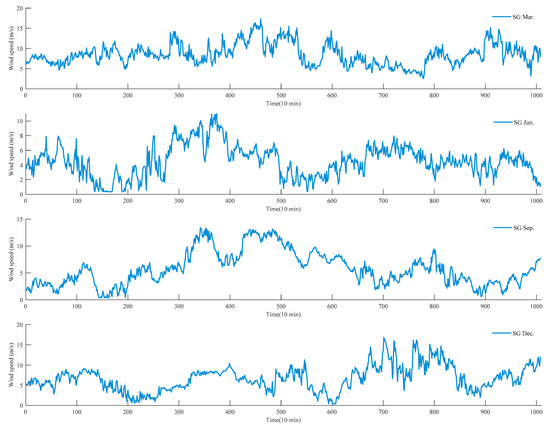 In this study, four cases of short-term wind speed data are collected from Sotavento Galicia (SG) wind farm, of which the data are recorded with a mean time interval of 10 minutes. Furthermore, these four cases are selected from SG for the time periods of 8–14 March, 7–13 June, 22–28 September, 8–14 December in 2018, which are named as SG Mar., SG Jun., SG Sep. and SG Dec. in the later experiments, respectively. The visualizations of all of the collected wind speed time series are shown in Figure 4, and the corresponding statistical information including the maximum (Max.) value, minimum (Min.) value, mean value, skewness (Skew.), kurtosis (Kurt.), and standard deviation (Std.) are exhibited in Table 1. It can be intuitively observed that the raw wind speed time series possesses strong non-linearity and non-stationarity, with which the precise forecasting model would be difficult to construct. Additionally, the phase space matrices corresponding to the forecasting components are deduced by PSR with various parameters, among which the last 288 samples are assigned to be the testing sets in all of the experimental cases.