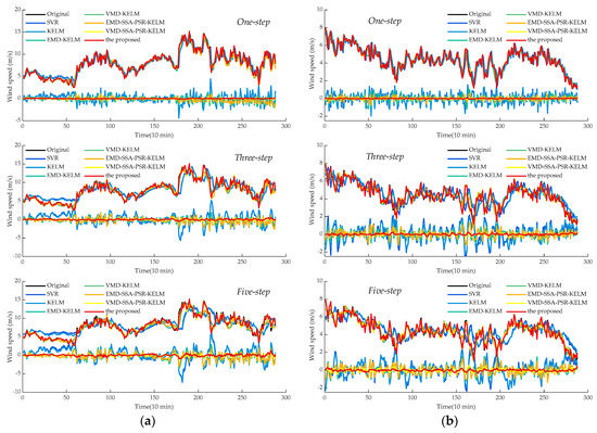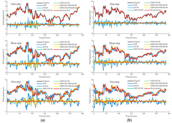 The multi-step forecasting results of various hybrid models in different cases: (a) the case of SG Sep.; (b) the case of SG Dec.
