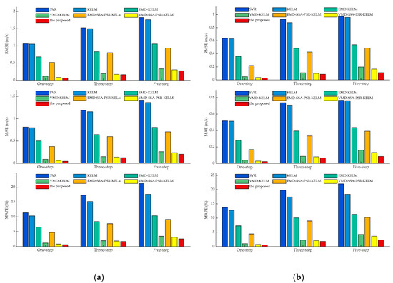 Comparison of all of the multi-step experimental results in terms of RMSE, MAE, and MAPE in different cases: (a) the case of SG Sep.; (b) the case of SG Dec.