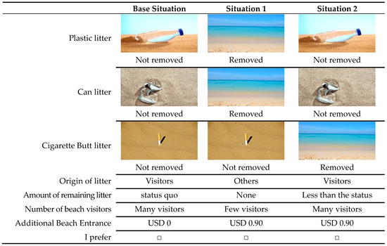 The third part was mainly about the perceived situations in the beach areas. For instance, respondents were asked about their perceptions of the number of sanitary workers, the price of plastic bags and the congestion on the beach. The fourth part introduced the different types of WTP for the combinations of the environmental improvements. The mean WTP varies across the alternative elicitation techniques. In this research, the payment card approach is applied in the questionnaire design because here the questions are easy to understand and various interval and numerical WTPs could be obtained for further research. The CVM and CEM are then carried out for the estimation of the WTP under the various removal conditions of marine litter. For the CVM, the core question was the visitors’ maximum WTP for the removal of the litter. Using different pictures of three main types of litter, this paper set up the payment questions as three types. The payment attribute was split into five levels: USD 0–0.29, USD 0.30–0.59, USD 0.60–0.89, USD 0.90–1.18, and USD 1.18 or above. The exchange rate is set at 6.75 (CNY/USD). In the CEM, visitors chose the environmental conditions combined with the associated entrance fee they would like to pay. Alternative situations were created by combining the attributes presented in Table 2. In order to make the visitors understand the environmental condition better, several significantly different kinds of pictures are used to illustrate the differences of sample beach conditions. In our face to face interview, the interviewers also explained the attribute levels in the hypothetical scenarios to the respondents for their consideration.