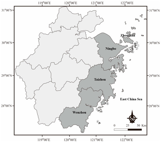 Note: 1.Ten Sands, 2.Daqing Mountain, 3.Mount Putuo, 4.Nanji Islands, 5.Dongtou Islands, 6.Taohua Island, 7.Tawan Golden Sand, 8.Dalu Island, 9.Shepan Island, and 10.China Fishing Village. 1. and 3. are AAAAA scenic spots while the others are AAAA scenic spots.