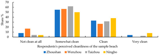 Figure 3 shows the average perception of beach litter in the four cities. A minority of the visitors (4%–17%) believed that the beaches were not clean at all. Over half of the visitors (50%–62%) considered that the beach was somewhat clean and more than a quarter of the visitors (27%–38%) considered that the beach was clean. Among the four levels of perceived cleanliness, somewhat clean accounts for the most in all of the cities. This indicates that the conditions regarding beach litter are not very good, as a result of which the social costs estimation is necessary in these areas.