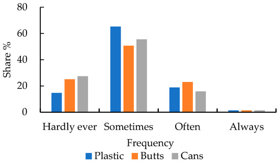 Figure 4 shows the five main litter types. They were butts, plastic, cans, glass and nets, the former three types being chosen for the choice experiment in Figure 1. In terms of the frequency of the litter, cigarette butts were mentioned the most and accounted for 60.83%, followed by plastic and cans that were rated at 42.82% and 42.70%, respectively. Glass and nets were approximately 34.63% and 31.61%, respectively. By assessing the frequencies using four levels, including Hardly Ever, Sometimes, Often and Always, the former three litter types’ frequencies are provided in Figure 5. The results are coherent with the conditions performed in Figure 3; the cleanliness in these sample beaches is not bad.