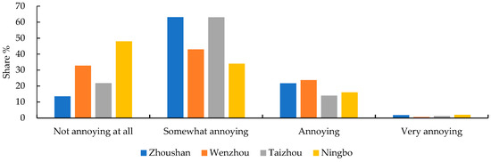 Figure 6 shows the perceived annoyance with beach litter. It is very interesting that “Somewhat Annoying” rates the highest, which is followed by “Not annoying at all”. Only a few visitors are very annoyed with the beach litter, accounting for 0.56%–2.00%. It means that Chinese visitors may often live in a worse surrounding with more litter or that the scenic beach is so clean that they greatly enjoy their coastal trip. Therefore, the relatively low WTP or to work might be reasonable and acceptable.