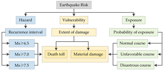 Figure 1 shows the conceptual framework of this study using the RISKPLAN method. Based on the data collection above and the definition of disaster risk elements in Section 1, the recurrence interval is classified by different earthquake magnitudes which represent three different scenarios. The earthquake risk of each seismic zone is defined in three dimensions, including the recurrence interval for a specific earthquake magnitude, the extent of damage on people and material assets, and the probability of exposure for different courses. The following section will give a detailed description of the conceptual framework in Figure 1.