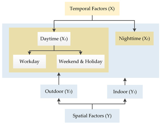 In order to calculate the probability of hazard exposure as a percentage, especially for an earthquake risk, the spatial factors indoor or outdoor are the most important indicators for earthquake risk assessment. The probability of being indoors or outdoors is affected by temporal factors as shown in Figure 2. Usually, the probability is higher that people are indoors than outdoors. At night, people are usually sleeping and cannot immediately respond to an earthquake disaster. Furthermore, it is relevant whether an earthquake happens on a working day, a weekend, or a holiday. This will have an influence on the probability that people are either more or less affected.
