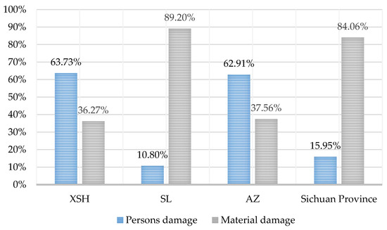 In this study, willingness to pay for an averted fatality is valued at CNY 5 million [58]. A willingness to pay for saving a human life is defined as the maximum sum that society is prepared to invest to prevent a fatality. This amount does not refer to the value of life itself, but to society’s willingness and financial capacity to calculate a possible death toll. Based on the assumed values, the total risk, including death toll and loss of material assets, can be measured in monetary terms. Figure 3 shows that the total annual earthquake risk of Songpan-Longmenshan, including both death toll and material asset losses, accounts for 90.22% of the total annual risk of Sichuan Province, which is the highest of the three seismic zones of Sichuan Province, followed by that of Xianshuihe and Anninghe-Zemuhe. Moreover, the results in Figure 3 indicate that there are big gaps in earthquake risks between Songpan-Longmenshan and the other two zones. This is due to active seismic activities in recent years (e.g., Wenchuan, Lushan, and Jiuzhaigou earthquakes happened in 2008, 2013 and 2017, respectively), while the population and economy experienced a rapid development over the past 40 years. In Anninghe-Zemuhe and Xianshuihe, the last earthquake events happened before the early 1980s, when the province was not as economically developed. Furthermore, Figure 4 shows the composition of total annual earthquake risk in Sichuan Province. For Xianshuihe and Anninghe-Zemuhe, the human damage is higher than the material damage, whereas the opposite holds for Songpan-Longmenshan. It is the same for Sichuan Province because of the highest proportion of annual earthquake risk indicated by Songpan-Longmenshan, as shown in Figure 3.