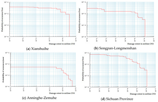 Figure 5 shows a frequency-number diagram representing the relationship between the annual probability of occurrence and the extent of damage of a certain region. This diagram is generated by ranking the hazard scenarios and the associated extent of damage. The presentation of the sum of the probabilities of the scenarios (cumulative probability) with the associated extent of damage produces a step function. It is possible to derive from this probability scale diagram the probability with which a certain extent of damage will be reached or exceeded [50]. Figure 5a–c represents the probability scale diagrams of each seismic zone, respectively; Figure 5d describes the relationship between annual probability of occurrence and extent of damage in Sichuan Province. In the diagram of Sichuan Province, the probability of occurrence that the extent of damage reaches CNY 1000 billion is approximately 0.3%. Similarly, when the extent of damage reaches 10 million CNY, the probability of occurrence is approximately 7%. All the diagrams also indicate that the probability of occurrence is decreasing with the increasing extent of damage.