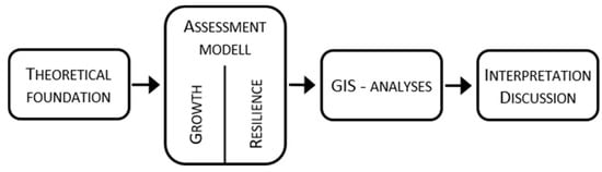 In the course of the study an assessment model was developed to evaluate regional and local resilience. An assessment based on growth-oriented criteria was used as a reference. Both models are based on the respective theories of regional development and resilience in a certain spatial context. The data were processed and executed in GIS. Subsequently, the results were analyzed, interpreted, and discussed (see Figure 1).