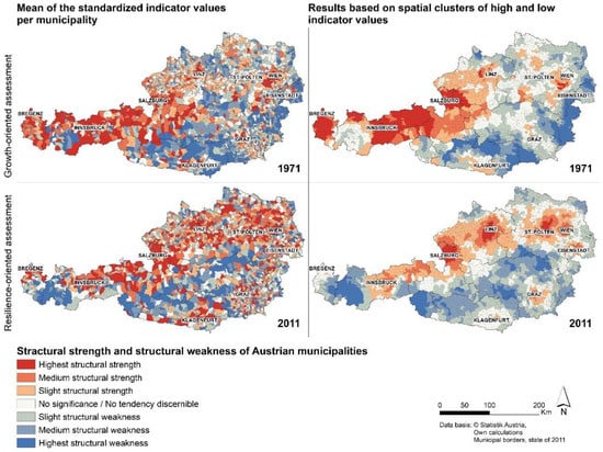 The study was conducted to gain deeper insights into regional development as well as into the emergence and development of spatial disparities. Two assessment approaches were applied to evaluate regional development, one based on the objective of increasing resilience and the other one on the objective of growth. Based on the assessments, the spatial development processes were interpreted based on the Austrian example. This led to an overview of the development processes, evaluated according to the two objectives. The instrument of resilience-oriented assessment clears the way for a new level of insight. Existing data is newly arranged and evaluated which enables conclusions on the ability of regions to handle crises. Clusters of high and low indicator values become apparent by means of spatial analysis. These kinds of results make it possible to determine the level of resilience of a region or an observation unit. There is no absolute scale for measuring resilience. It can only be evaluated relatively, comparing the resilience of different spatial units within the study area. The following striking similarities and differences between the development trends show: (1) Growth-oriented structural strength is related to resilience-oriented structural strength (e.g., Upper Austria and Salzburg); (2) growth-oriented structural weakness is related to resilience-oriented structural weakness (e.g., inner Alpine locations); (3) growth-oriented structural strength is related to resilience-oriented structural weakness (e.g., western Tyrol and eastern Vorarlberg); and (4) growth-oriented structural weakness is related to resilience-oriented structural strength (northern Lower Austria).