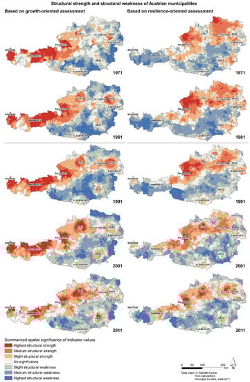 - Höferl, K.-M.; Jelinek, B. Vom Konstrukt zur Empirie: Beobachtungen zur „Strukturstärke bzw. Strukturschwäche“ österreichischer Gemeinden. In REAL CORP 007: To Plan Is Not Enough: Strategies, Plans, Concepts, Projects and Their Successful Implementation in Urban, Regional and Real Estate Development; CORP–Competence Center of Urban and Regional Development: Schwechat-Rannersdorf, Austria, 2007; pp. 781–790. [Google Scholar]