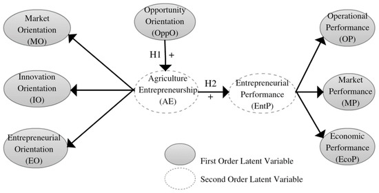 We establish a framework and postulate a mediating role of agriculture entrepreneurship between opportunity recognition and farmers’ entrepreneurial performance. For this purpose, one superior order latent variable is formulated from the first order-latent variables. To explain this point, second-order latent variable agriculture entrepreneurship is reflexively formulated by the first-order latent variables viz: market orientation (MO), innovation orientation (IO), and entrepreneurial orientation (EO). To utilize superior-order latent variable, structural model is crucial which allows greater statistical robustness and theoretical parsimony while avoiding model complexity [49]. Hair, Hult [50] summarize this point as a theoretical utility, i.e., theory requires general constructs consisting of particular facets or dimensions. It also makes two hypotheses, based on the influence of opportunity recognition on agriculture entrepreneurship, and the impact of agriculture entrepreneurship on farmers’ entrepreneurial performance (see Figure 1).