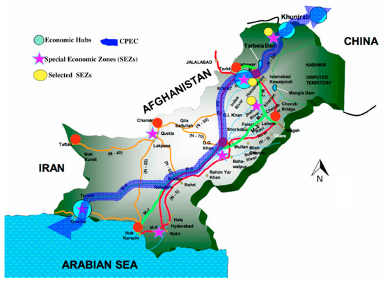 The population for this study was framed from three out of nine major economic zones in Pakistan. Under the CPEC project, several special economic zones, industrial estates, business parks and export processing zone are being established across the country [7,102]. For that purpose, Allama Iqbal Industrial City, Rashakai Economic Zone, and Bostan Economic Zone were selected as these three are key zones for agriculture sector under the CPEC (see Figure 2).