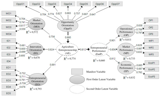 Table 5 presents the statistical quality of second-order latent variables on agricultural entrepreneurship being the most central latent variable and directly linked with the study hypotheses. It is clear that it has an AVE value below 0.5. In order to better fit the model, it is possible to remove some manifest variables in first-order latent variables with factor loading below then required (>0.7). This way, among first-order latent variables, manifest variables with lower loadings were eliminated as: (1) concerning the latent variable MO, the indicator MO4, (2) latent variable IO, the indicator IO1, (3) latent variable EO, the indicator EO5, and in the latent variable OppO, the indicators OppO6 and OppO7 were excluded. Thus, by doing so, we set-up a new structural model, as can be seen in Figure 4. Table 6 presents the results of the revised structural model, as per our study parameters that yielded satisfactory indexes. For the evaluation of model adjustments, we used discriminant validity which indicates the extent to which a construct truly varies from other constructs. Furthermore, it helps to figure out to what extent the newly settled construct relates with other constructs and also reveal the number of measures that show only a single construct. According to Hair, Sarstedt [106], among other methods to evaluate discriminant validity, the most robust one is to verify the variables if they have higher factor loadings in their original factors compared with other constructs.