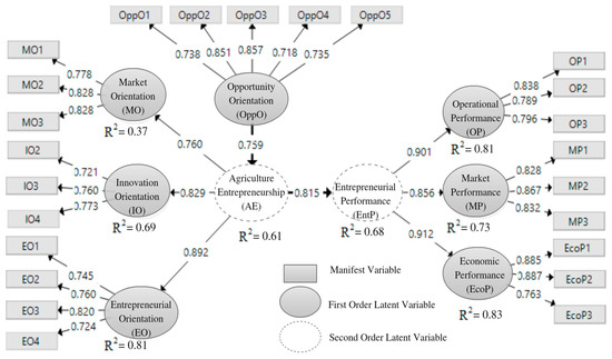As per observation of Guinot, Latreille [114], the existence of superior-order latent variable occurs in a specific condition when all of the latent variables are also correlated. Table 4 shows correlations among all constructs related to opportunity orientation, agriculture entrepreneurship and entrepreneurial performance of farmers’ (operational, market and economic).