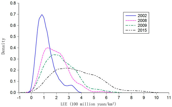 Kernel density estimation (KDE), which can both smooth data and preserve the overall structure, is one of the nonparametric estimation methods in statistical analysis. Compared with econometric approaches, nonparametric methods are much more flexible and adaptive in modeling [44]. By estimating the probability density of variables, KDE can capture the distribution and dynamic evolution of economic variables. The principles of KDE can be found in the relative literature [45,46]. Using the value of LUE, we adopt KDE in this study to estimate changes in the distributions of LUE.