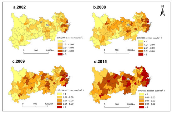 The spatial distribution of LUE in the YREZ is characterized by significant regional disparities and spatial agglomeration at the prefecture-level cities from 2002 to 2015 (Figure 4). From the perspective of geography, two main features are worth noticing. First, high values of LUE are chiefly concentrated in the Yangtze River Delta, and the LUE in Shanghai is the highest. Meanwhile, the LUE of certain cities in the upper reaches of the Yangtze River is generally lower than that of the central and eastern cities. Second, the high value of LUE is mainly located in provincial capital cities, presenting a significant agglomeration effect. Also, the agglomeration characteristic becomes increasingly obvious over time. Three clusters are formed gradually.