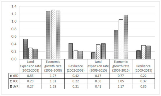 Figure 5 shows the trends of construction land expansion, economic growth, and resilience in different regions. During the period of 2002–2008, the YRD witnessed a relatively faster expansion of construction land, but the economic growth rate was slightly lower than that of other areas. As a result, the YRD has a higher coefficient of resilience, showing that economic growth in the YRD had a greater dependence on construction land expansion in the early stage, and its LUE has greater potential for improvement. Partly due to the financial crisis in 2008, the economic growth rate of the whole region between 2009–2015 slowed down. The rate of construction land expansion in the YRD decreased during this period, while the rate in the other two regions appeared to increase. In terms of resilience, the level of an intensive use of land in the YRD has been improved. However, the TCC and the UYR need to further control the scale of construction land.