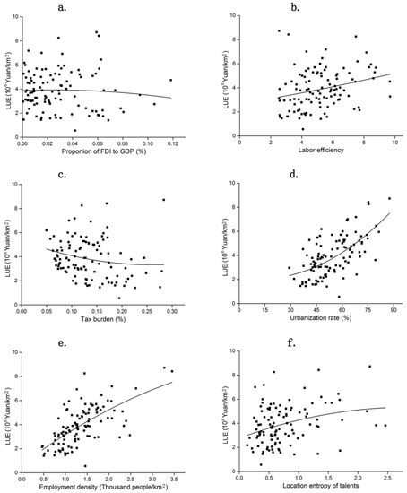 In order to further capture the influence of key factors of economic transition on the LUE, Figure 6 shows a detailed relationship between LUE and some key factors in 2015. It is clear that tax burdens and the proportion of FDI to GDP are negatively correlated with LUE on the whole. In the meantime, labor efficiency, urbanization, and the agglomeration of industry and talents exert positive effects on the improvement of LUE during economic transition. In essence, the relationship between these key variables and LUE reveals the mechanism of the spatial–temporal differentiation of LUE. In comparison with other areas, eastern cities have superior location conditions. They are often the forerunners of policy and economic development. Pilot-oriented policies such as coastal open cities are also taking the lead from the eastern cities. What’s more, the Yangtze River Delta urban agglomerations in the east provide an important platform for China to participate in international competition. According to the “Yangtze River Delta Urban Agglomerations Development Plan” approved by the State Council, the Yangtze River Delta Urban Agglomerations should be built into a world-class urban agglomeration that gears to the world and leads the whole country. In addition, frequent trades and technical exchanges provide them with more important positions in the international development framework. Coupled with a higher level of marketization, stronger capacity of agglomeration, and faster urbanization, these areas have greater economic development potential and land-use efficiency. They have abilities as well as incentives to promote an intensive use of land. However, there is no doubt that the influx of FDI and the increasing tax burdens due to rapid infrastructure construction further raise the possibility of land expansion and the risk of LUE reduction.