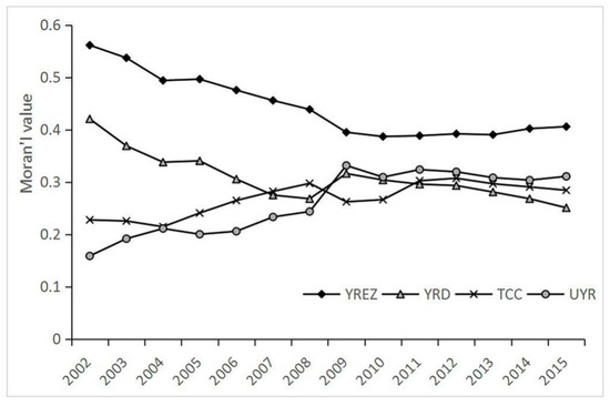 The global Moran’s I values in the YREZ, Yangtze River Delta (YRD), Triangle of Central China (TCC), and upper reaches of the Yangtze River (UYR), 2002–2015.