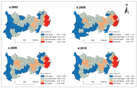 To further capture the spatial distribution characteristics of high-value clusters and low-value clusters of LUE, we compute the Getis–Ord Gi* index in ArcGIS 10.2. Based on the Natural Breaks (Jenks), we divide the into four categories, i.e., hot spots, sub-hot spots, cold spots, and sub-cold spots (Figure 8). Overall, the spatial pattern of hot spots and cold spots remains stable. Hot spots and cold spots present point–axis interlaced distribution, and the regional disparity is significant. The number of cities in sub-cold spots decreased from 55 in 2002 to 42 in 2015, while the number of cities in sub-hot spots increased from 18 in 2002 to 32 in 2015, indicating a rise of 77.8%. Although there are some changes in the spatial pattern of hot spots and cold spots, the number of corresponding cities has little change. The local spatial distribution characteristics of LUE are mainly reflected in two aspects. First, LUE in coastal cities or cities along the river is higher than that of inland areas. Second, the average level in the east is higher than that in the west. In the process of economic reform and transition, coastal cities or cities along the river can better exert their comparative advantages in location and transportation, and attract external investment. Therefore, these regions have greater potential to become hot spots for LUE changes.