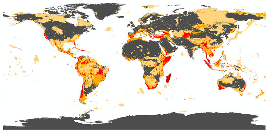 Global coverage of cropland (occupation) [110] overlapping with reactive conservation schemes. Areas on which the land use type cropland does not overlap with reactive schemes are colored green. Areas where cropland coincides with one or more reactive conservation schemes (BH, AZE, EDGE, and IBA) [44,50,59,102,103,104] and schemes with high irreplaceability (CPD and G200) [45,51,106] are colored yellow to red.