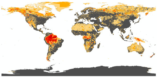 We propose to further develop the approach of ref. [53] (used or further evolved by refs. [42,60,98,99,100]) by synthesizing existing global conservation schemes in order to create a global uniform risk map that covers biodiversity priority areas for different taxa and at all scales (genetic, species, and ecosystem). Existing maps are used and the relative number of priority sites are calculated per grid cell for all reactive and proactive schemes, similar to ref. [53,100]. This approach yields two unified risk maps (one for reactive systems and one for proactive systems) with values ranging from 0 to 1 depending on the relative number of biodiversity risk sites per grid cell. Both risk maps can be added in order to receive one global uniform risk map containing both proactive and reactive conservation sites. Herein, areas with proactive sites are more important for assessing the effects of transformation, while areas with reactive sites are crucial for assessing occupation impacts. The global coverage of the reactive schemes is depicted in Figure 1 and the global coverage of the proactive schemes is depicted in Figure 2. The color palette ranges from light yellow to dark red and reflects the number of critical sites for biodiversity. Gray represents areas where no reactive or proactive conservation scheme has been identified. Both maps include all critical areas proposed by [42,53], with the exception of Crisis Ecoregions [46], as we did not have access to the data. In addition, the Megadiversity Countries [101] were excluded as they represent species richness only at the country level. According to ref. [53] maps that do not consider vulnerability but only focus on irreplaceability, such as the G200 and CDP [53] for the reactive schemes, were also included. They are included as part of the reactive schemes, since all other reactive conservation schemes also incorporate measures of irreplaceability (such as the BH, AZE, EDGE, and IBA) [44,50,59,102,103,104]. Whereas most of the proactive schemes only focus on low vulnerability and do not account for any irreplaceability measures, except from the High Biodiversity Wilderness Areas (HBWA) [43,84]. Furthermore, in order to meet the requirement concerning the different levels of biodiversity, conservation schemes are included into the risk map that highlight areas that harbor phylogenetically different species [49,50,105] or species with an important gene pool [51].
