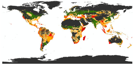 For the regionalization of land use, we propose for our methodological framework to use the uniform global risk map. This map is intersected with land use maps (e.g., for cropland, forestry, pasture, plantation, and urban areas) in order to determine where land use takes place (occupation), which type of land use (see refs. [11,110]) and whether and to what extent it falls into one or more biodiversity risk areas, similar to ref. [100]. The same approach is used for the investigation of land transformation. Here however, maps, e.g., for cropland suitability [110,111] or urban development scenarios [112,113], are used and overlaid with the unified global risk map. Figure 3 shows (in green) the areas where the land use type cropland takes place (occupation) and does not intersect with reactive conservation areas. From a life cycle perspective it would be better with respect to biodiversity impacts for a company to source their crop from such areas. The areas where the land use type cropland falls into one or more areas of high vulnerability or irreplaceability for biodiversity is depicted in the color range from yellow to red, depending on the number of risk areas affected. Figure 4 shows examples of areas that might be suitable in future for cropland production (green = no overlap with proactive schemes) and the potentially affected reactive risk areas for biodiversity (yellow to red).