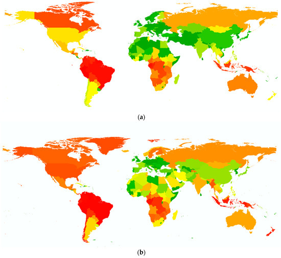 As can be deduced from the two figures, and as has been highlighted [53], the spatial distribution of the proactive and reactive schemes is almost complementary, and they cover almost the whole world [53]. Still, there are some sites that are covered by both schemes. This is mainly due to the fact that the G200 sites as well as the Centers of Plant Diversity (CPD) are included in the reactive map. These maps only account for irreplaceability and not for any vulnerability measures so that they might overlap with proactive schemes. These graphs should also illustrate that notwithstanding whether an LCIA method concentrates on reactive or proactive systems, there are some important biodiversity sites which are not included or evaluated. If, for example, the method only considers the occurrence of threatened species, important sites for biodiversity conservation, such as intact ecosystems, are not addressed adequately. Maps for the development of the global biodiversity risk map are presented in Table 2, classified according to the level of biodiversity they represent, the taxa, and whether they represent low and high vulnerable (proactive and reactive) or irreplaceable areas of biodiversity, based on refs. [42,53].