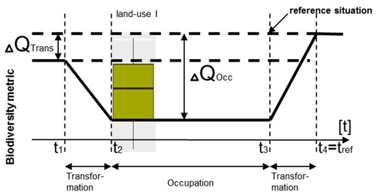For the second level, it is necessary to distinguish between the impacts of different types of land use in the context of its regionalization. The majority of biodiversity methods in LCA is able to distinguish between different land use types and to assess their local impacts on biodiversity [30,68,69,71,72,74,77,87,88,89,90,93,94,95]. Some of the methods however, only apply to one specific land use types, such as forestry [67,78], cropland [70,75,80,91], and mining [79], or do not take into account any land use type at all [81,92]. The impact of a specific type of land use is usually measured using the UNEP SETAC framework [97,115]. Herein, the change in biodiversity quality due to land occupation and transformation is compared to a reference situation. This reference situation can be any biodiversity metric such as change in species richness or abundance, e.g., in primary vegetation, the naturalness level of an ecosystem, or potential natural vegetation. For hemeroby, the degree of ecosystem degradation due to land use is assigned to so-called hemeroby levels, where the highest degree means that an ecosystem is close to a natural state and the lowest degree indicates a high degradation of ecosystems [116]. Sometimes abstract values, such as the maximum potential biodiversity, are used as a reference situation. These are defined by a range of conditions that have to be fulfilled for achieving the highest biodiversity quality [67,92]. The change in biodiversity quality between the reference situation and the land use type gives a value for land use impacts on biodiversity (see Figure 6). Limitations of existing LCIA methods at this level are that they are usually very species- or taxa-specific or only apply to certain land use classes. Most methods at the global-level use only data from vertebrates or vascular plants. Methods at the ecosystem level are usually not empirically validated and sometimes subjective (e.g., relying on expert knowledge).