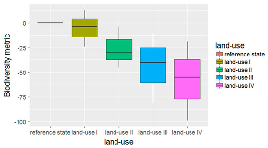Since the PREDICTS database enables the assessment of land use types on the basis of different biodiversity metrics (e.g., abundance, species richness, composition, and function), it is possible to calculate an index or to provide values for each single biodiversity metric, such as the biodiversity intactness index [121] based on ref. [122]. For the background data (e.g., the supply chain), the default value for the impact on biodiversity for occupation is always the average worst scenario (the mean value for intensive land use). This applies, for example, to the supply chain if no specific information is provided other than the land use types involved in the life cycle of a product. Within the interval, changes in biodiversity impacts are possible by changing management parameters and thus the land use intensity (the interval for a type of land use is always the same, but the value of biodiversity quality varies according to the intensity). This additional information can be obtained from primary data (see Section 3.2.3—Land Use Intensity and Management Parameter). Positive impacts on biodiversity are also possible for land use types where the interval exceeds the reference state. If no further information is available (e.g., if the company only knows that its resources originate from pasture in Brazil) improvements in the impact on biodiversity are only possible by switching to resources from one type of land use, which is on average less harmful than the other, or by changing the origin of the resources. For the assessment of transformation impacts, the average biodiversity quality of one type of land use is compared with the biodiversity quality of another land use type (transformation from: the biodiversity quality of the historic land use type is compared to current land use types; transformation to: biodiversity quality of current land use type is compared to the quality of the future land use type). Studies on the impacts of land use on biodiversity have shown that in average forestry and pasture have a lower impact on biodiversity than arable land [22,123]. Urban areas have the worst impacts when intensively used, but also the largest interval based on the land management [22]. Furthermore, there is no statistically significant difference in the impacts of land use types on biodiversity (in relative terms), depending on broad biogeographical regions in which they occur [22,120]. This justifies the use of a land use quality factor for biodiversity that depends only on the type and intensity of land use and not its location. Moreover, these results allow us to decouple the quality values of biodiversity impacts due to the land use type from the regionalization factor, as there is no statistically significant difference in relative terms, but only in absolute and qualitative terms.