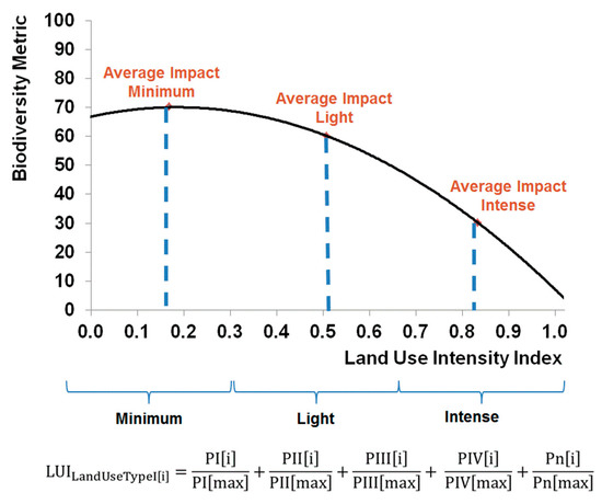 Conceptual model for the relation of Land Use Intensity Index (LUI) based on refs. [126,127,128,129] for land use type I to Biodiversity Metric based on ref. [22] and Management Parameters P[i].
