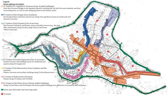 The plan of Caltagirone, Italy: seven morphological spheres and 13 typological sectors. Source: translated and adapted from Leone, Iacona, Merlo, and Quartarone [72] (p. 72–73).