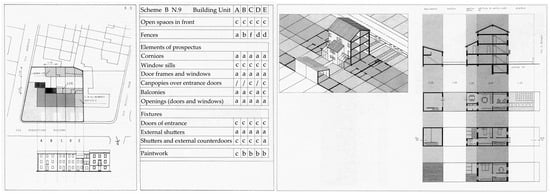 The plan of Schio around 1990 is worthy of attention. The project focused on a workers’ settlement with only about 100 years’ history rather than a traditional historic center. To address the destruction triggered by increasingly haphazard and inappropriate private additions and renovations since the 1970s, the plan identified five intervention categories (A–E) for the whole neighborhood according to the historic, cultural, and architectural value, with each block indexed by a sequential number (A1, A2, …) [73]. For each block and plot, a corresponding specific scheme of plans, sections, and facades was devised, involving precise guidelines for managing and controlling the variation in morphological elements of buildings and public spaces (Figure 3) [73]. Notably, the project produced a handbook that was distributed to local inhabitants (both owners and tenants) and the public for guiding and managing their addition and renovation actions.
