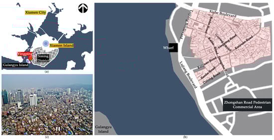 (a) City of Xiamen and site of Yingping; (b) Yingping’s street structure and its surrounding environment; (c) aerial view of Yingping. Source: translated and adapted from School of Architecture, Huaqiao University [74].