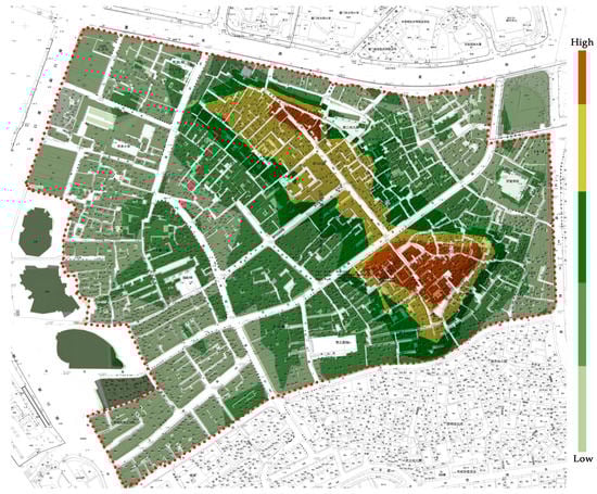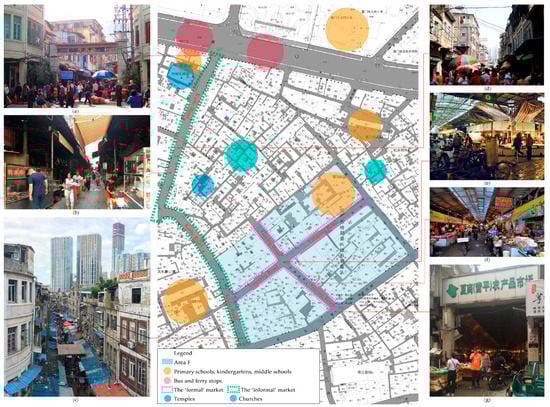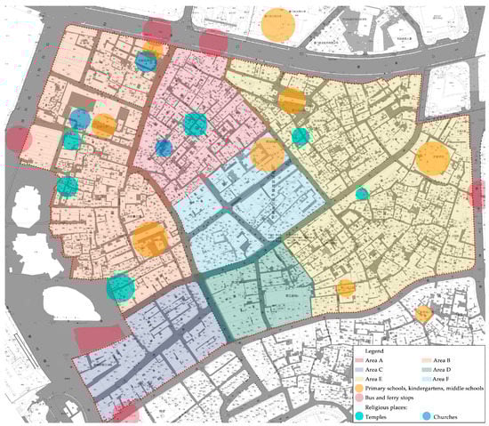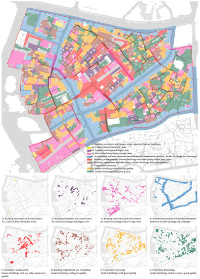 Mapping onto the aforementioned five intervention groups, six typical areas were identified (Figure 13, Table 2), according to relatively homogeneous geographic, physical, and sociological characteristics (with particular focus on the morphological features of built spaces through the history, quality of buildings and environment, customs, spatial practices, and activities, and living behaviors) and essential planning problems being faced. This interpretation was inspired by the Italian morphology-led planning technique and Banham’s ecological interpretation and relevant practical planning experiences. Here, the six areas can be deemed as entities that are the result of the encounter between space and society, urban materials and users, and the experiences of users.