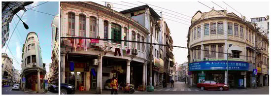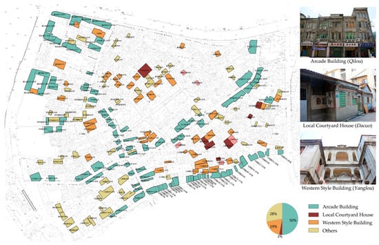 Except for some main streets, Yingping generally has a labyrinthine, stratified, heterogeneous, and high-density urban fabric (Figure 5), which may be attributed to the complex topographic condition, traditional customs, and long-term spatial practices, and some historic and social reasons. A morphological reading is presented through the discussion of the six characterized areas. Regarding typological features, there are three main building types (Figure 6): arcade building (Qilou), local courtyard house (Dacuo), and Western-style building (Yanglou). As its name implies, arcade buildings refer to those where a part of the ground floor comprises arcades and pedestrian walkways to keep off the rain and sun. Since the shop space is located on the ground floor and living space is on the upper floor, they are also called “shophouses” in English. They are mainly distributed in the coastal cities of southeast China (e.g., Quanzhou, Xiamen, Guangzhou, Hong Kong, Haikou, etc.) and southeast Asia (e.g., Malaysia, Singapore, etc.). In terms of Yingping, the arcade buildings, situated along main streets, are more plentiful than the other two and play a key role in shaping the local historic urban landscape (Figure 7). The distribution of the other two is more fragmented.