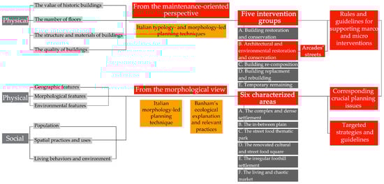 In general, abovementioned “zoning” techniques and associated interpretations, based on the morphological perspective and the ecological lens, form the core logic of the research method of this study. The term “zoning” here is different from the conventional one that is based on the merely functional approach and widely used in modern urban planning as an unrefined and all-powerful tool shaping cities, but proved to be a failure in many urban contexts [15]. Instead, it is developed as a two-pronged multi-layered fertile planning framework (see the research framework in Figure 9). Firstly, from the maintenance-oriented perspective, five intervention approaches are grouped according to different grades of interventions to support and rule macro- and micro-interventions, with a specific focus on the leading structural elements of the urban fabric: the arcade streets. Secondly, from the morphological view and through the ecological lens, six characterized areas are identified and classified with respective morphological features and planning issues for discussing corresponding optimizing strategies and suitable guidelines.