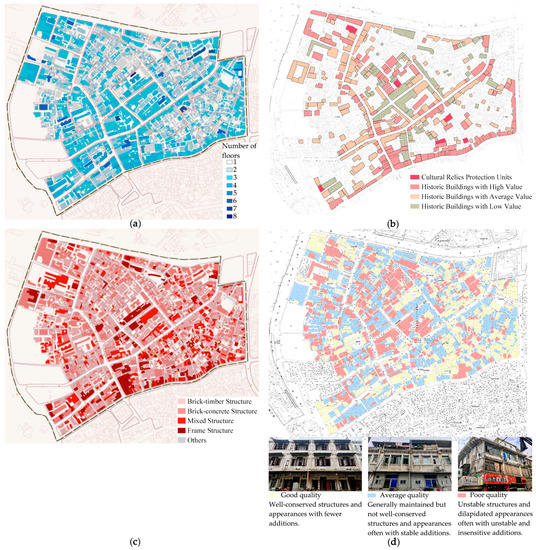The physical survey of the site: (a) the number of floors, (b) the value of historic buildings, (c) the structure and materials of buildings, and (d) the quality of buildings. Sources: (a) and (c) translated and adapted from Urbaneer [87]; (b) translated and adapted from School of Architecture, Huaqiao University [74].