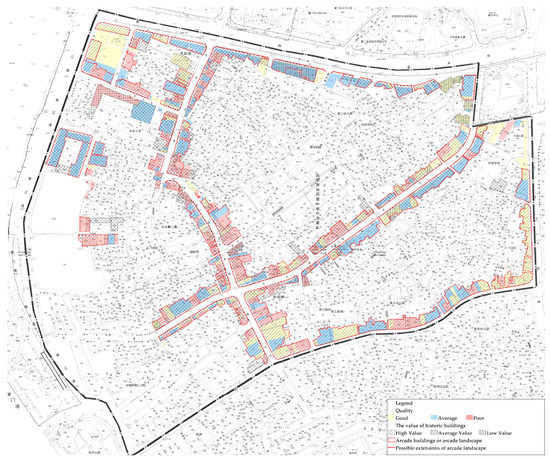 Based on the survey and analysis of the physical situation, including building structure and materials, quality, and number of floors, as well as the value of the historic buildings (Figure 10), five intervention approaches (Figure 11, Table 1) of Yingping were grouped involving different grades of building groups and their surrounding urban fabric and environment. Respective intervention aims and strategies were created in both the physical and social dimensions. Such interpretation was inspired by the identification of five intervention categories shown in the case of Schio. Among the five groups, a specific focus was on group B—arcade buildings and landscape—where building types may be treated as an engine driving intervention actions inspired by the Italian typology-led planning technique. The layered analysis of the arcade buildings and landscape is presented in Figure 12, incorporating the value and quality of historic buildings. Based on the analysis and a review of relevant practical research [85,86], possible strategies for treating arcade buildings and landscape are proposed, covering the macro and micro dimensions (Table 1). The findings suggest the need for creating a specific “zoning” plan for arcade buildings and landscape, across the neighborhood of Yingping and the surrounding area, and even the whole city.