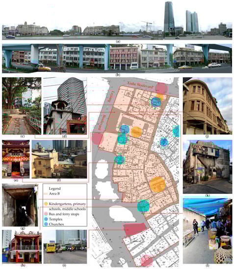 Compared with Area A, Area B generally manifests a vertical-oriented urban fabric to the water with fewer dead-end roads and T-junction streets (Figure 5). Most of the present inhabitants are descendants of early settlers from three ethnic sub-groups. With similar cultural, religious, and vocational backgrounds, the early settlers, from about the 1850s, knew each other well and created a stronger sense of community that was maintained. That may explain why this area has higher-quality public buildings (including some well-maintained temples) and community life, demonstrated by the diversified and significant religious activities with fewer thoughtless additions occupying streets, alleys, and public spaces. However, there are many rough and poor-quality low-rise houses due to the limited economic condition. More importantly, situated in a flat plain, this area has the longest interface with two boulevards and the sea, and plays a key role linking Yingping to its surrounding. Figure 14 outlines the fragmented, interrupted, and incoherent urban landscape along the boundaries, such as the invasive incoherent skyscrapers and overpass; the narrow and dark passages supported by a temporary structure; the disordered, crowded, and poorly managed public bus stops (due to a lack of facilities); the newly-built pseudo buildings; the many poor-quality and decaying buildings; and the crowded and poorly managed roadside business. Despite some irreversible changes, the broken link and heterogeneous and incoherent urbanscape must be addressed, together with the poor-quality public spaces around boundaries. The treatment of boundaries should be carefully considered, for instance, how to build some diversified and meaningful buffer zones. Possible strategies involve the replacement of blind walls, poor-quality and low-value buildings, narrow and dark passages, and temporary structures with useful landscape facilities with local featured elements (for example, related to the image of arcade streets). Additionally, the roadside business of seafood and poultry should be better managed and organized with the development of some weekend and/or holiday markets and activities with local cultural and historic features, e.g., antiques and crafts fairs.