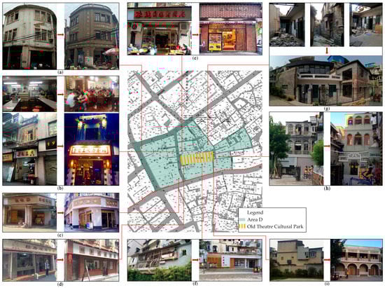 Area D: buildings before and after renovation: (a) Huangshengji Dried Meat Floss Shop; (b) Taro Bun King Restaurant; (c) Xinji Teahouse; (d) Laicuocheng Dumpling Restaurant; (e) Tong’an Bouilli Pork Restaurant; (f) the Old Theater Coffee; (g) the Gallery of Antique Furniture; (h) the Art Gallery of Yile Paper Cuttings; (i) Dajingjiao Alley No. 3–5. Source: photos (a–i) from Lin [92] (p. 44,50,57,60,81–86).