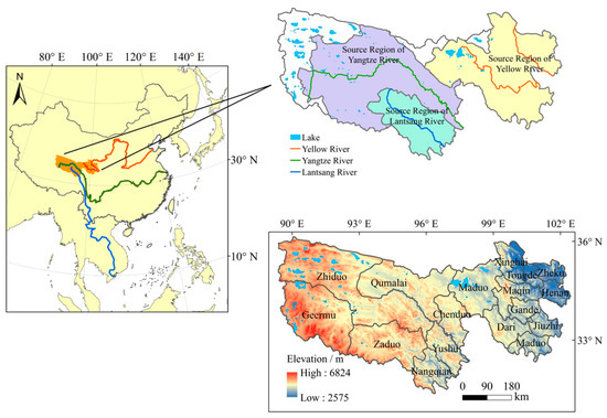 The study area is the TRSR (see Figure 1), which located in the hinterland of the Tibetan Plateau (31°39”–36°12” N, 89°45”–102°23” E), known as the “Water Tower of China”, the headstream of three major rivers in East Asia (i.e., the Yangtze River, the Yellow River and the Lancang River). Around 40% of the world’s population depends on, or is influenced by, these rivers [20]. The TRSR covers an area of 350,000 km2, in which the area of SRYa, SRYe, SRLa accounts for 43.2%, 39%, and 17.8%, respectively [21]. The TRSR is mainly constituted of mountainous landform with the altitude of 3335–6564 m. The climate is typical high-altitude plateau monsoon type, with annual mean temperature from −5.38 °C to 4.14 °C and annual precipitation from 262.2 mm to 772.8 mm [22]. The grassland ecosystem is primary in the TRSR region, which accounts for 65.37% of the total area. The population is about 568,000 and most of the residents are nomadic Tibetan [21]. Because of rigorous climate and topography, grassland ecosystems in this region are fragile and consequently prone to damage and degeneration [22]. Over the past decades, grassland degradation in the TRHR has attracted much attention. The lives of residents are threatened by a deteriorating regional ecosystem and declining water conservation function.