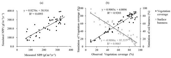 Comparison between simulated and measured data. (a) Actual NPP validation, (b) vegetation coverage and bareness index validation.