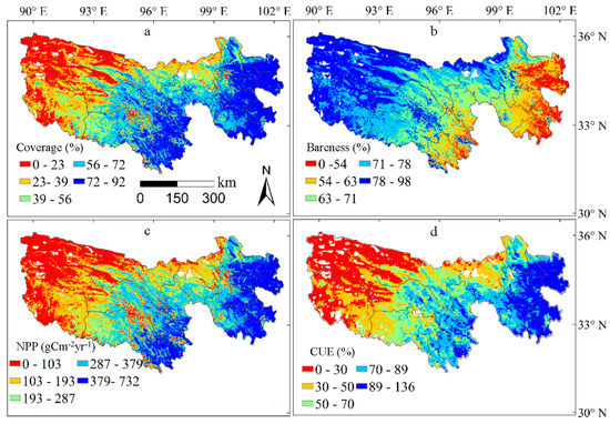 Spatial pattern of mean annual index in the TRSR over 2001–2016. (a) Vegetation coverage, (b) surface bareness, (c) NPP and (d) CUE.
