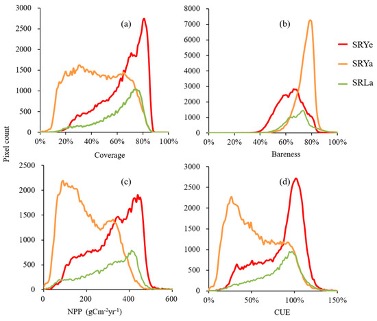 We counted the different pixel values of vegetation coverage (Figure 4a), surface bareness (Figure 4b), NPP (Figure 4c), and CUE (Figure 4d) in the three river source areas: SRYe had high vegetation coverage, NPP, CUE, but low bareness. The average coverage, bareness, NPP, and CUE were 59.50%, 58.98%, 321.86 g cm−2 year−1, and 84.01%, respectively, whereas the corresponding distribution rates of their peak values were 60–85%, 50–80%, 290–500 g cm−2 year−1, and 75–120%. SRYa had low vegetation coverage, NPP, CUE and high bareness. The average coverage, bareness, NPP, and CUE were 40.17%, 74.75%, 196.97 g cm−2 year−1, and 53.13%, respectively, whereas the corresponding distribution rates of their peak values were 15–80%, 70–85%, 50–350 g cm−2 year−1, and 15–100%. SRLa had low vegetation coverage, NPP, CUE and high bareness. The average coverage, bareness, NPP, and CUE were 51.42%, 62.71%, 300.26 g cm−2 year−1, and 80.94%, respectively, whereas the corresponding distribution rates of their peak values were 60–72%, 60–75%, 350–450 g cm−2 year−1, and 80–110%.