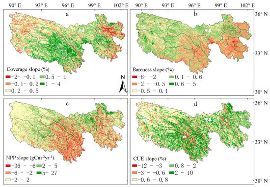 We analyzed the trend of four ecological indicators during 2001–2016, the spatial pattern of which is shown in Figure 5. In the whole of TRSR, the vegetation coverage has an overall upward trend (not shown in the fig) with average annual change rate of 0.53% year−1 (p < 0.01). The fastest growing regions were Maduo, Xinghai, and northern margin of Zeku County. The distribution of the coverage’s rapidly decreasing region was dispersed (Figure 4a). The average value of surface bareness exhibited a downward trend at a rate of −0.24% year−1 (p < 0.05). The area of rapid decrease was concentrated in SRYe, Gander, Long, south of Maduo County, and northeast of Yushu County, all located in the southern part of SRYe. The fast-growing area was in northwest Golmud, Xinghai and Maqin (Figure 5b). NPP has an insignificant downward trend (−0.71g Cm−2yr−2) (p > 0.05). The area where NPP decreased rapidly was concentrated in the southern parts of SRYa and SRLa. The fast-growing area was located in Xinghai and Zeku County northern margin (Figure 5c). The CUE showed an insignificant upward rate of 0.45% yr−1 (p > 0.05). The fastest-growing regions were in Dari, Gande, Moduo, Chengduo County and the eastern parts of Qumalai and Zaduo County (Figure 5d).
