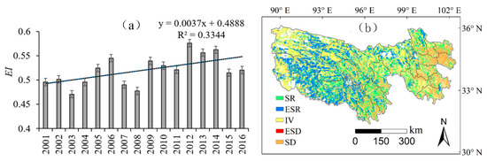 Dynamics of EI (a) and the grassland degradation/restoration situation (b) of Three-River-Source from 2001 to 2016. Note: SR indicates significant restoration, ESR indicates extreme significant restoration, IV indicates insignificant variation, ESD indicates extreme significant degradation, SD indicates significant degradation.